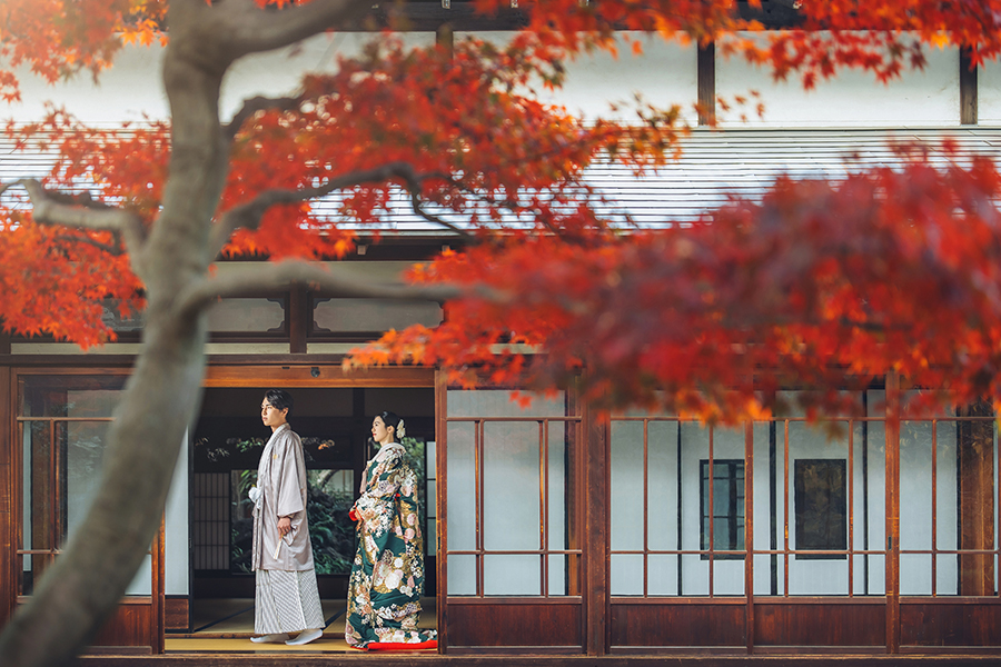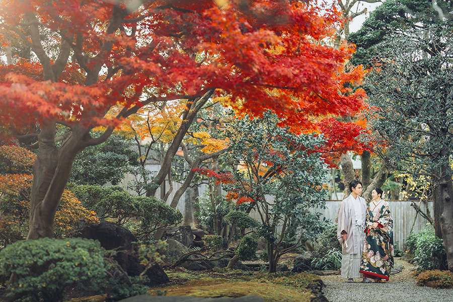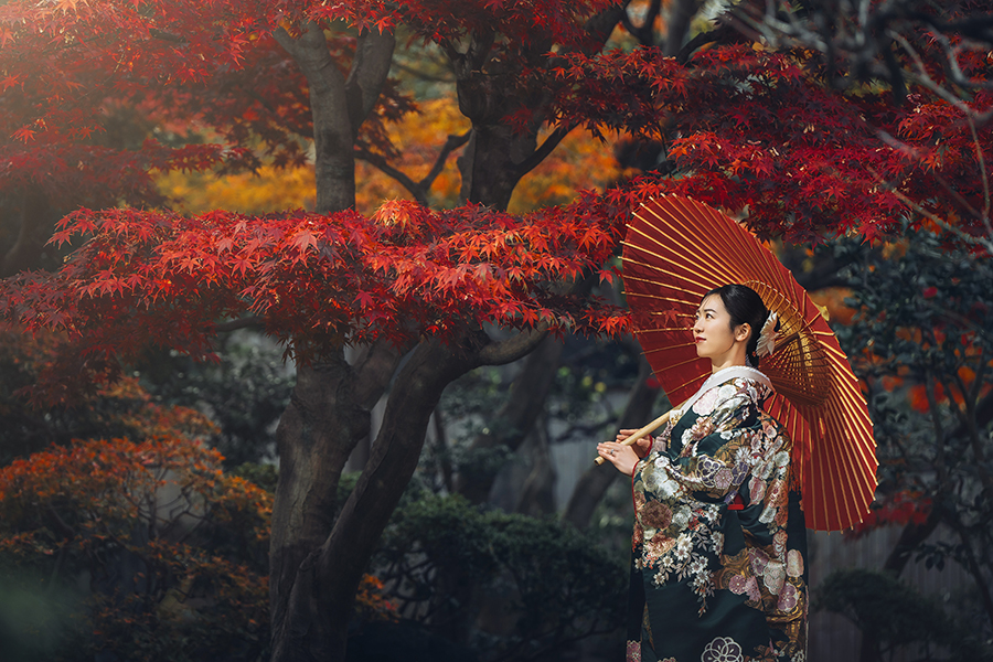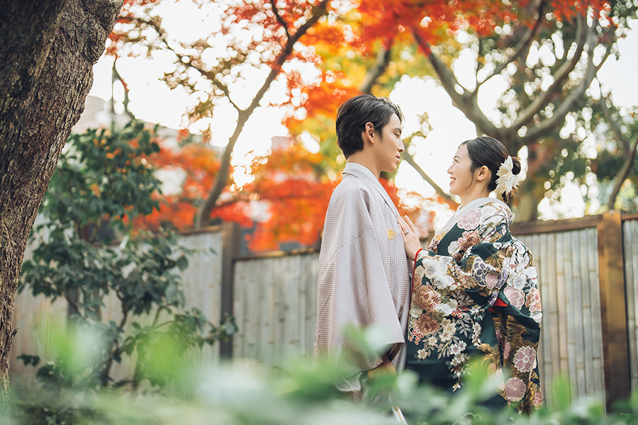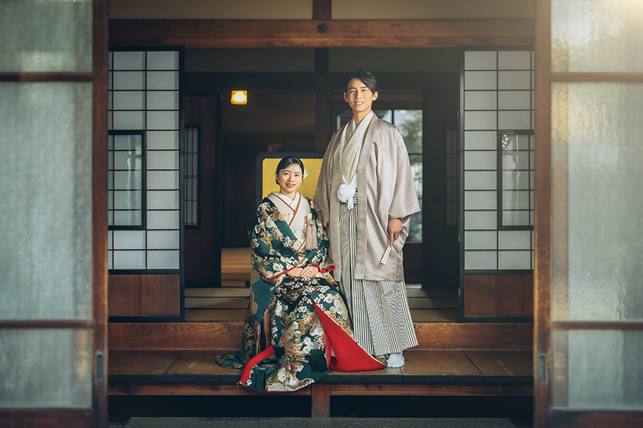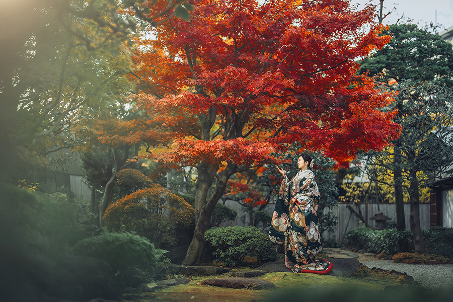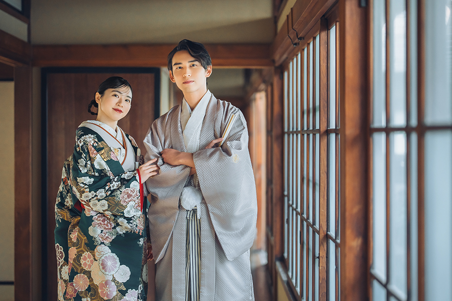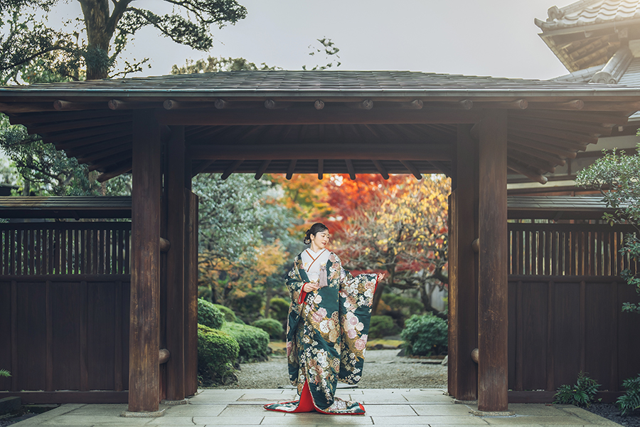 重ね襟のブラウンや裏地にあしらわれた赤がアクセントとなり、凛とした中にも温かみを感じさせます。