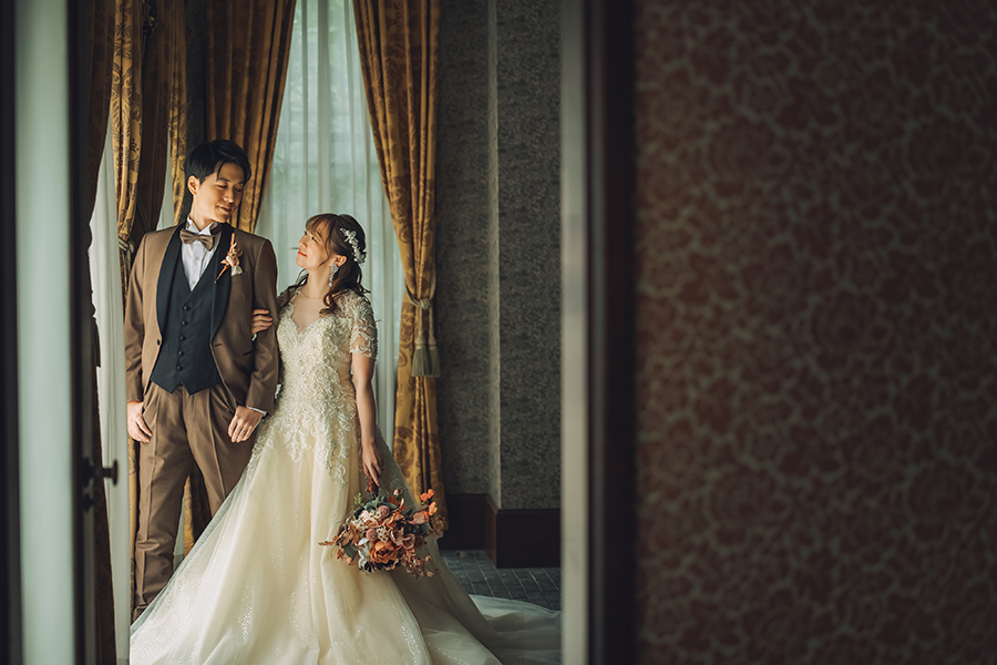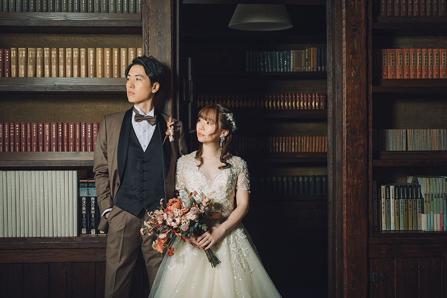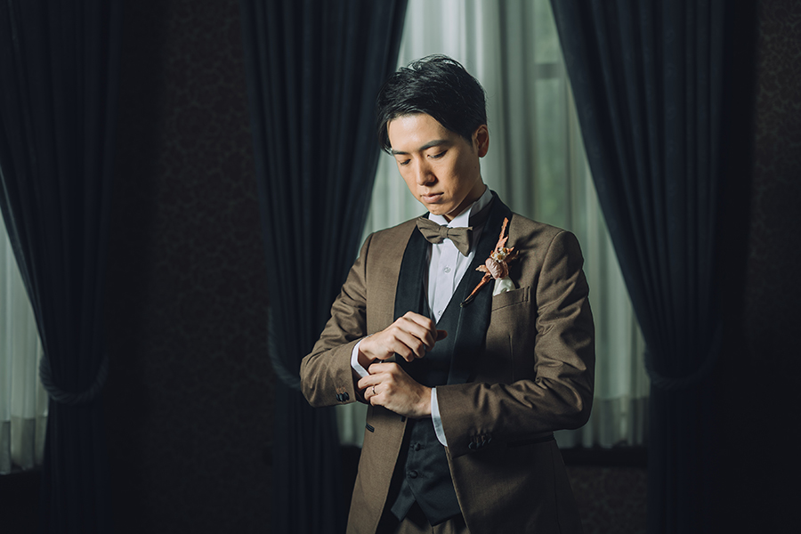 深みのあるブラウンが印象的な、クラシカルなタキシード。