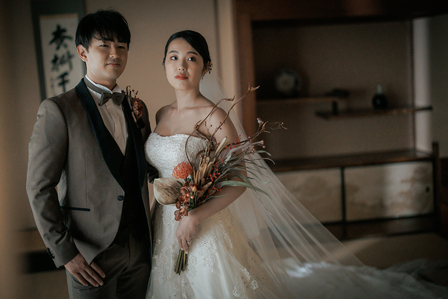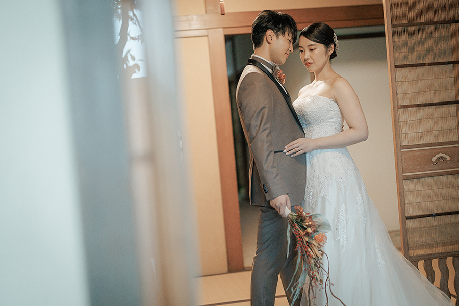 和邸宅でのブラウンタキシードはモダンな雰囲気がでて、