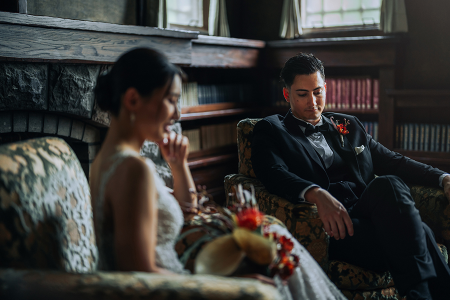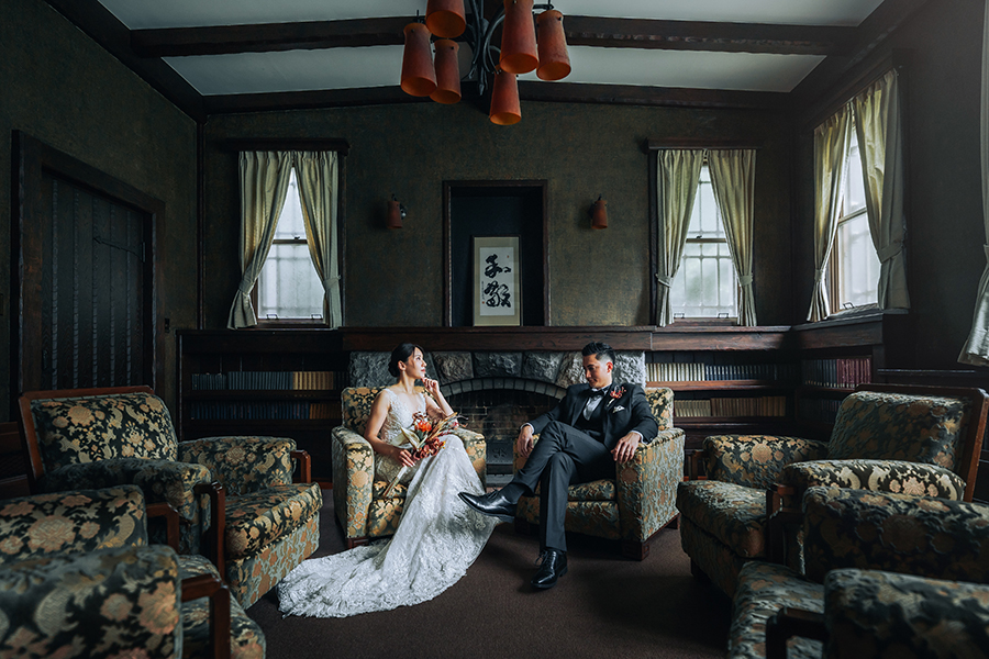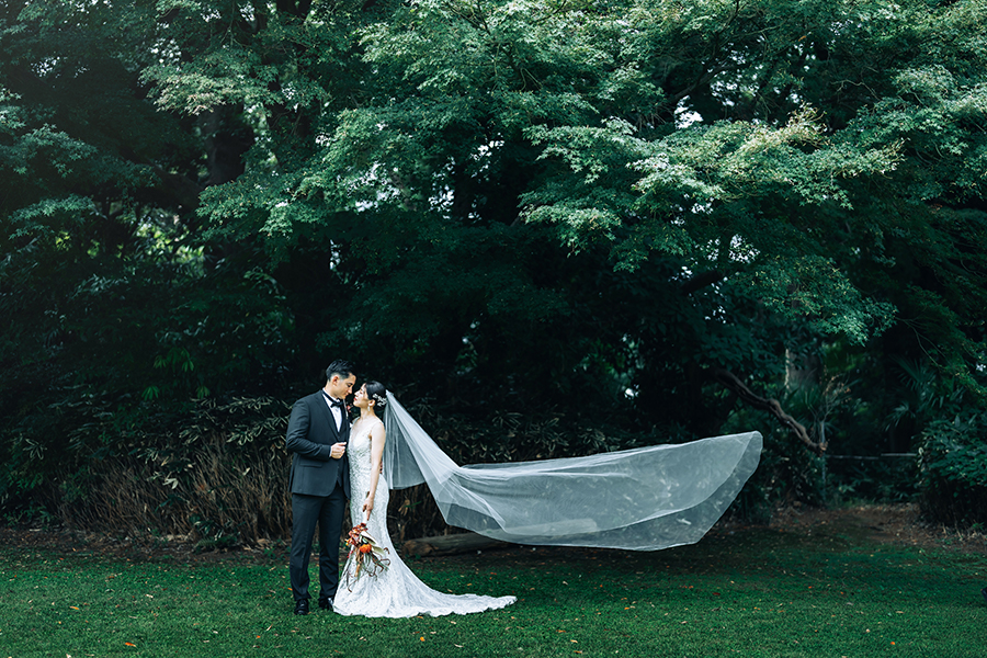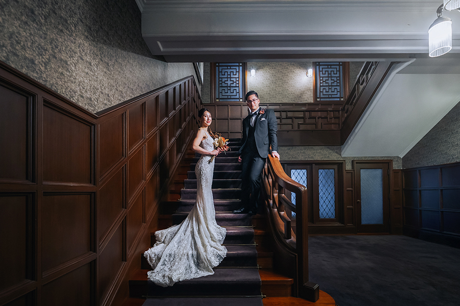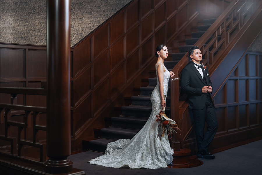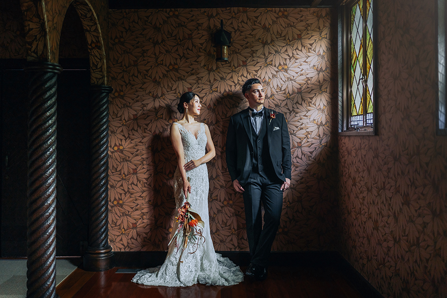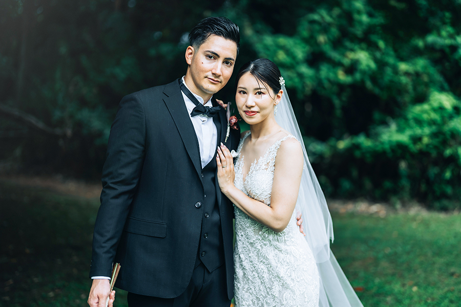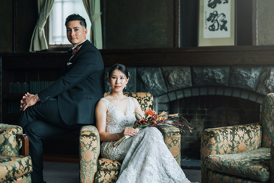 シャープなシルエットと洗練されたディテールが、花嫁のエレガントな装いと美しく調和します。