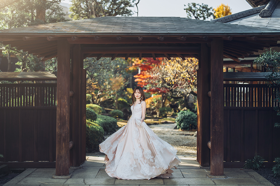 シンプルながらも繊細なレースが全体に施された、上品なストラップレスのウェディングドレスです。柔らかなAラインシルエットが美しく広がり、和室の静かな空気感の中で花嫁の存在感を一層引き立てています。