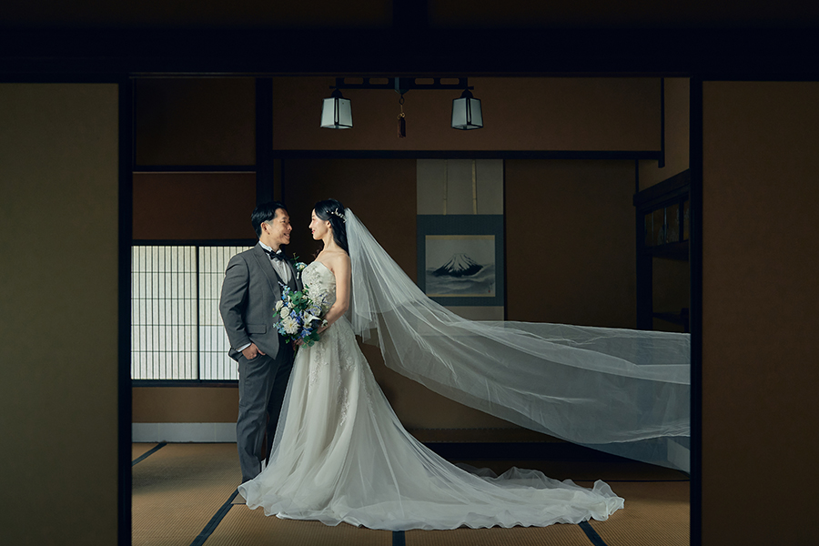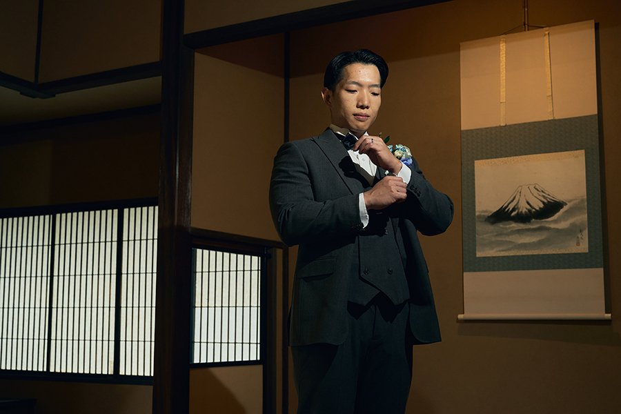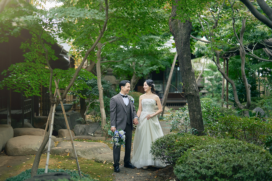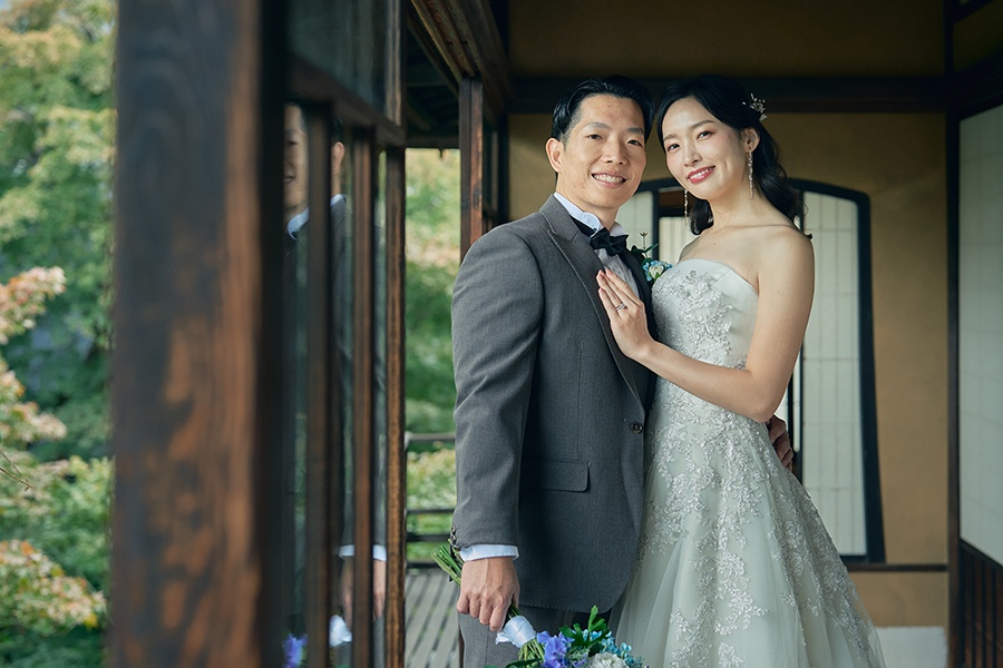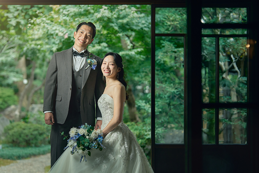 庭園の緑や和邸宅の木の質感とも美しく調和し、かしこまりすぎない上品さが魅力。